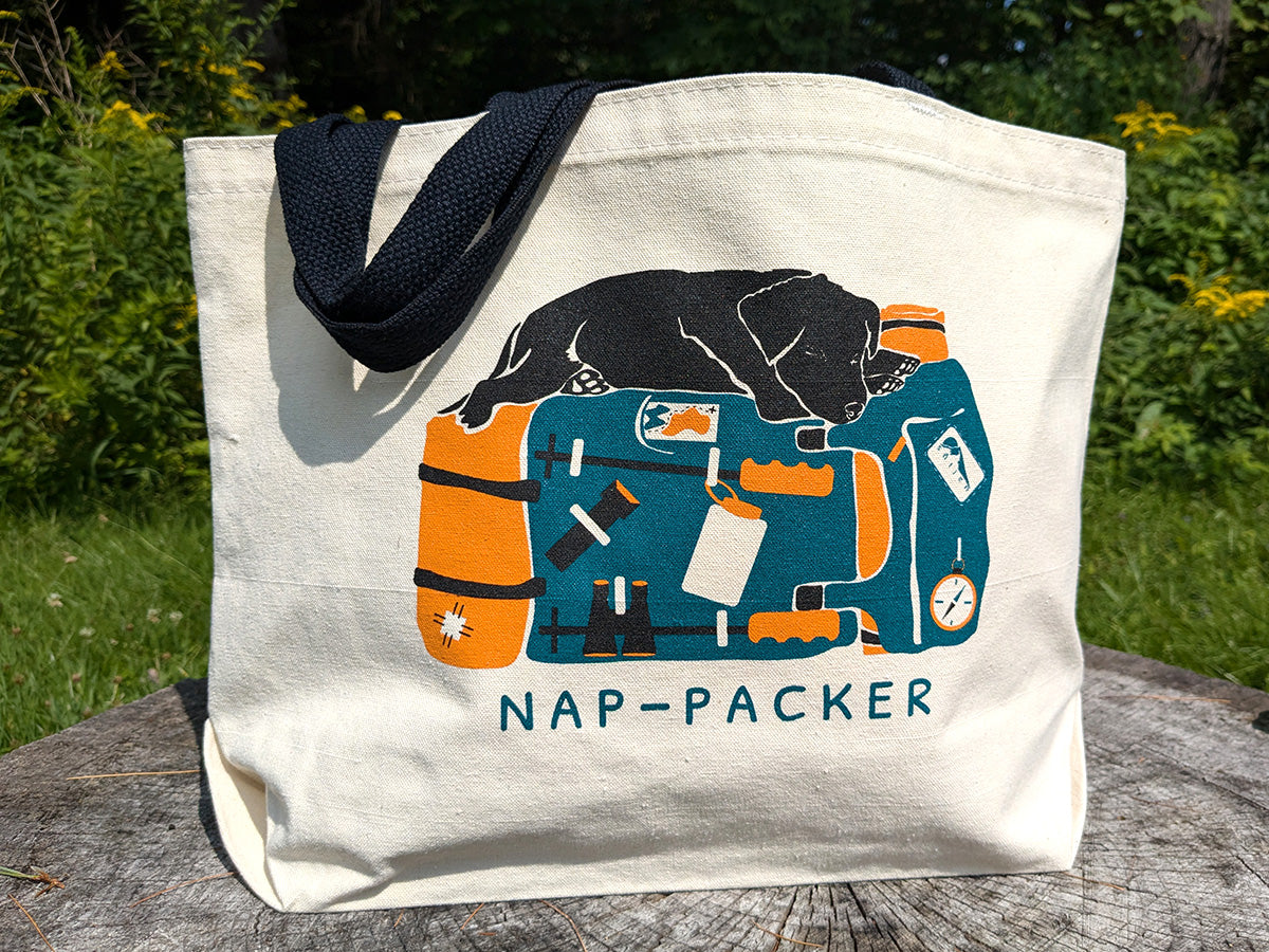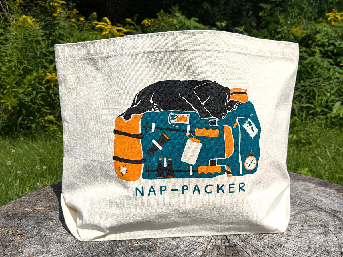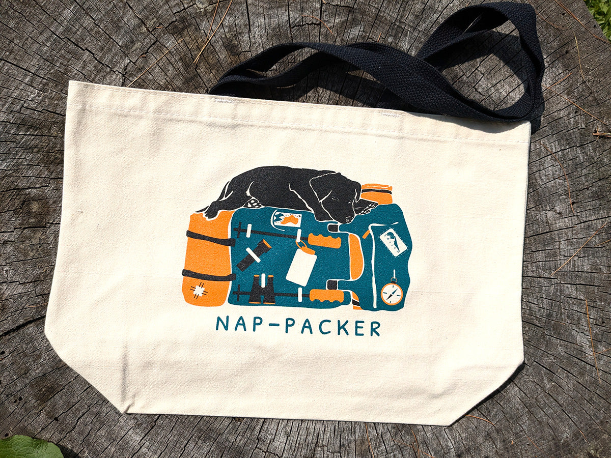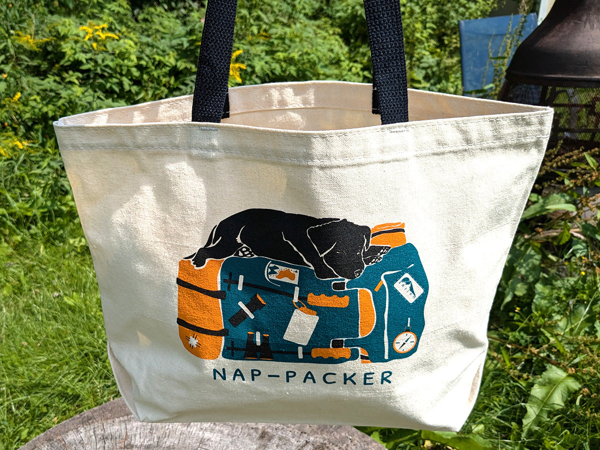 This playful tote bag features an adventurous & sleepy pup taking a nap on top of a backpacking pack with the words "Nap-Packer". This sturdy and spacious tote is perfect for a trip to the farmer's market measuring 18 x 12 inches with a 6 inch wide bottom gusset and a 25 inch black handle.
